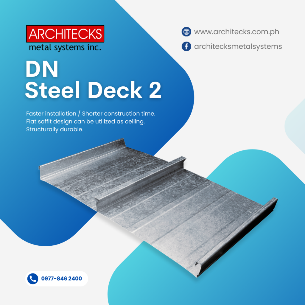 A flat soffit design that can be used as a ceiling is the DN Steel Deck 2. Suitable for usage in commercial, industrial, and residential buildings, this material comes with various thicknesses.
